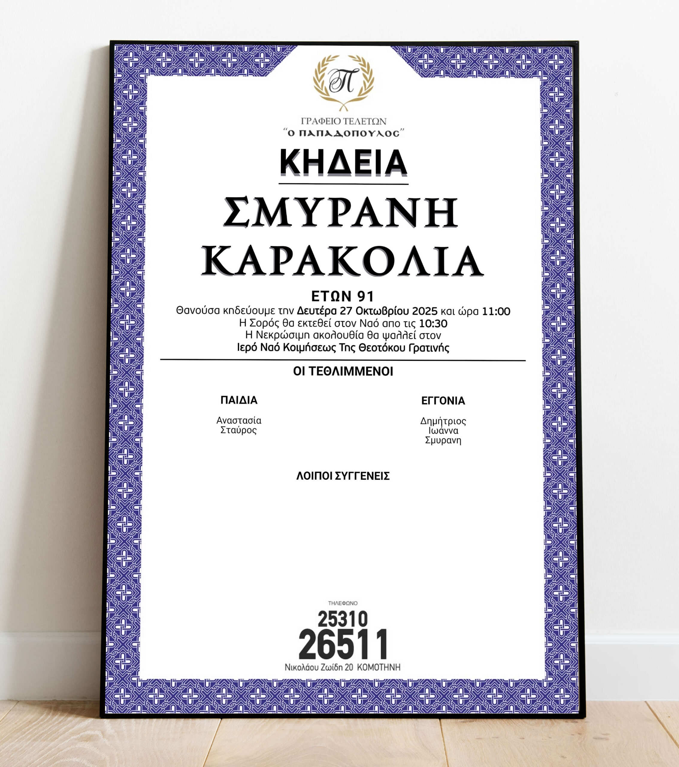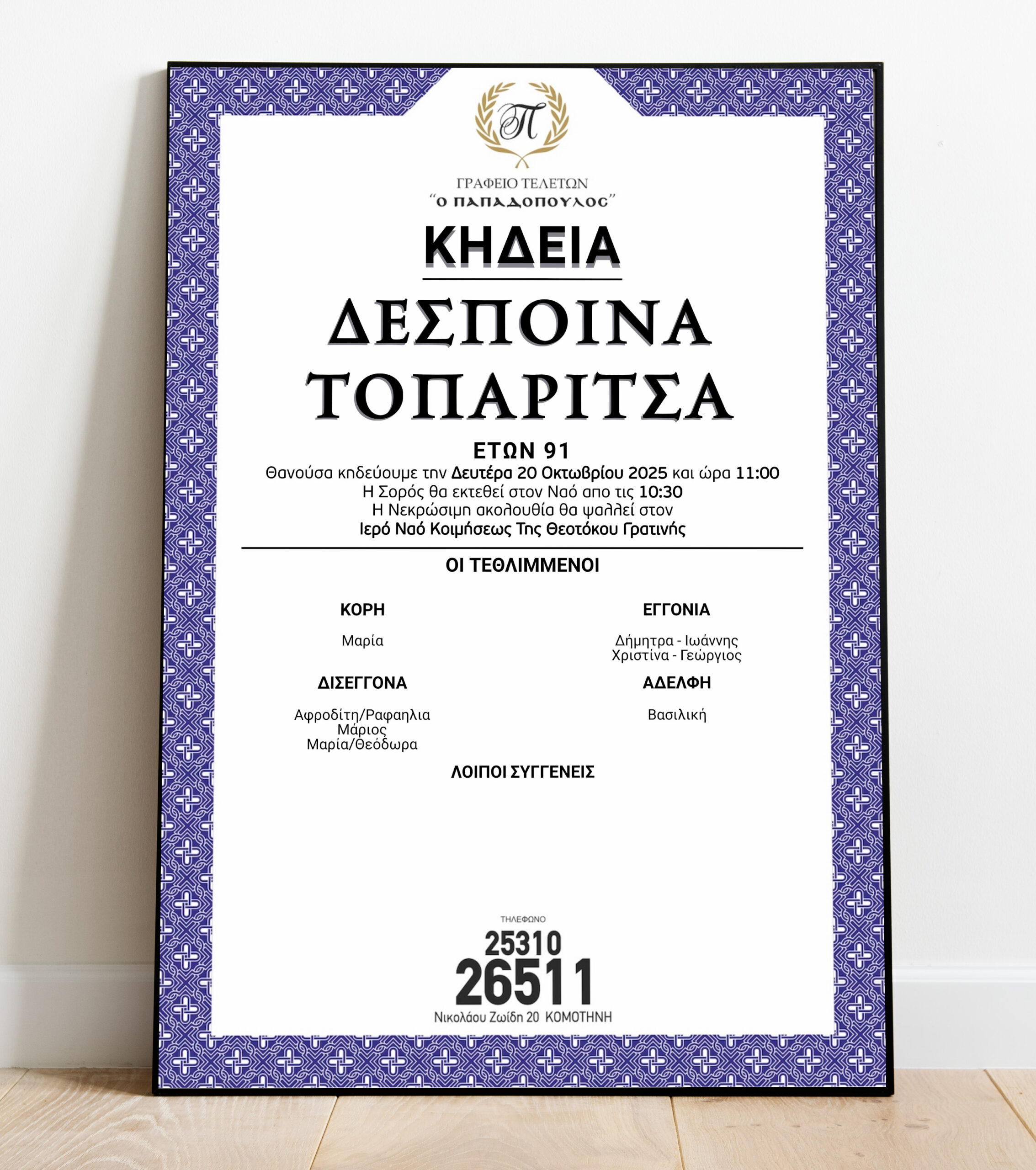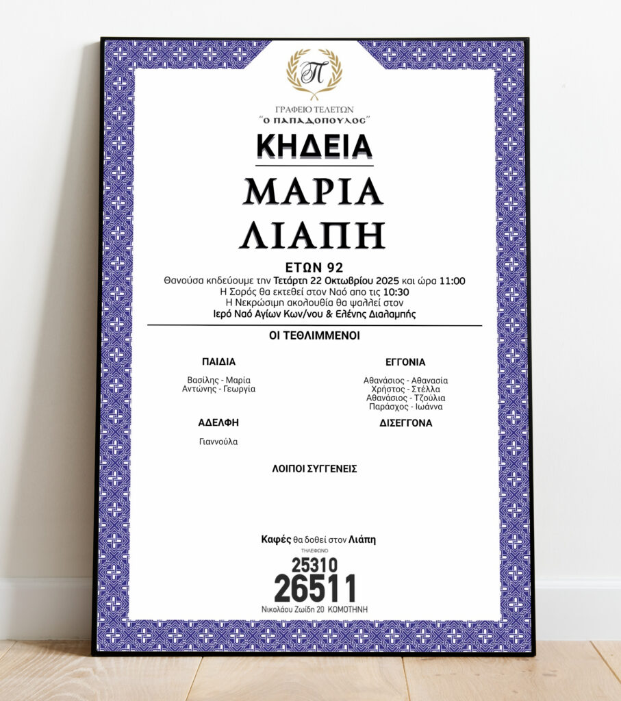 Μέσα από την κοινή μας συμμετοχή, ενδυναμώνουμε τους δεσμούς της κοινότητάς μας και διατηρούμε ζωντανή τη μνήμη των αγαπημένων μας στις καρδιές μας. Αυτές οι στιγμές, αν και γεμάτες θλίψη, είναι επίσης πηγές δύναμης και ελπίδας για το μέλλον. Στα αγγελτήρια που ακολουθούν, θα βρείτε λεπτομερείς πληροφορίες για τις ημερομηνίες, τις ώρες και τα μέρη όπου θα πραγματοποιηθούν οι τελετές και τα μνημόσυνα.