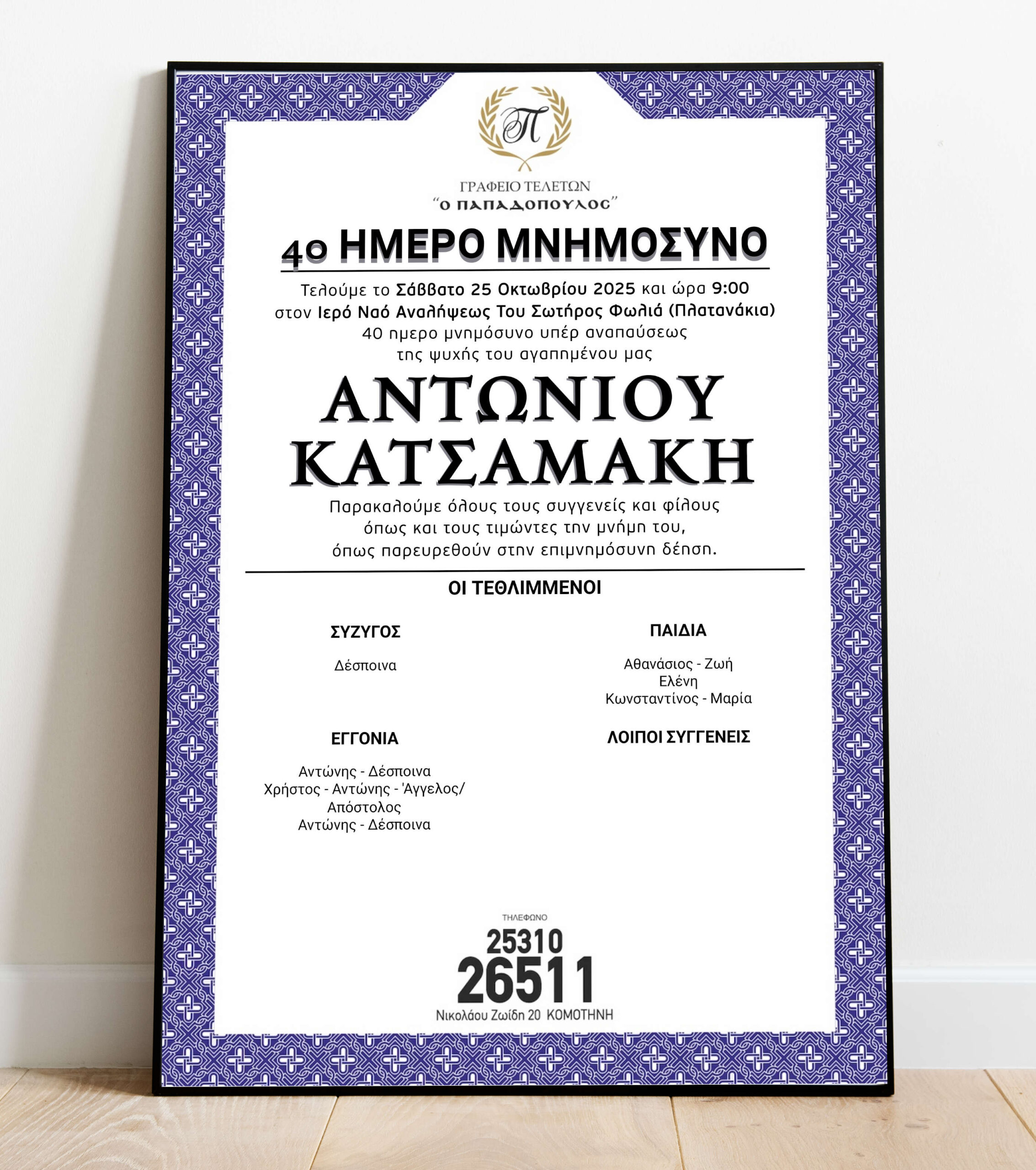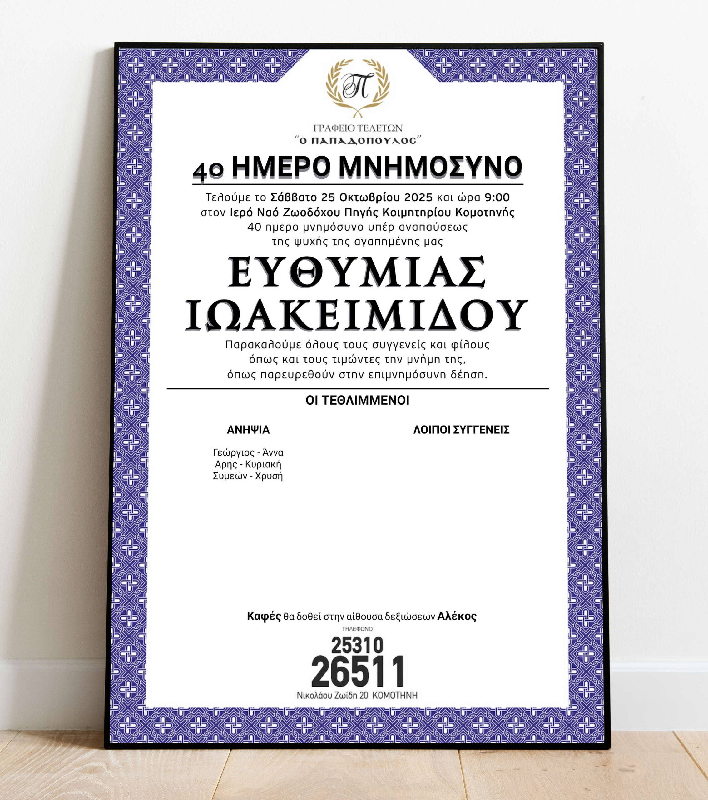 Κάθε μνημόσυνο αποτελεί μια σημαντική ευκαιρία για εμάς να εκφράσουμε τη βαθιά μας εκτίμηση και να δείξουμε στους πενθούντες ότι δεν είναι μόνοι σε αυτή την δύσκολη περίοδο. Μέσα από την κοινή θλίψη και τις κοινές αναμνήσεις, μπορούμε να βρούμε τη δύναμη να συνεχίσουμε και να διατηρήσουμε ζωντανή τη μνήμη των αγαπημένων μας στις καρδιές μας. Στα παρακάτω αγγελτήρια θα βρείτε πληροφορίες για τα μνημόσυνα που διοργανώνονται στη μνήμη τους.